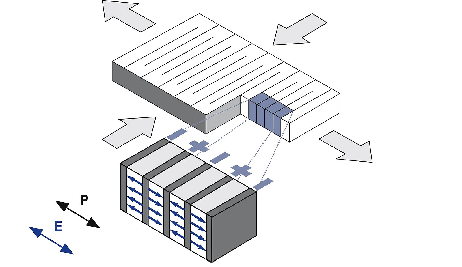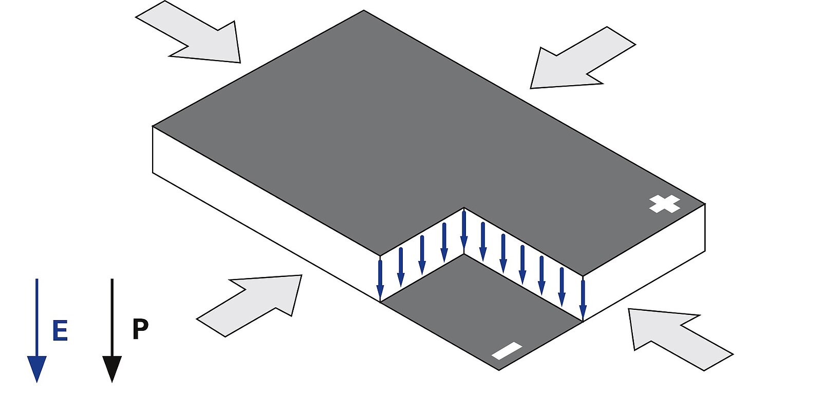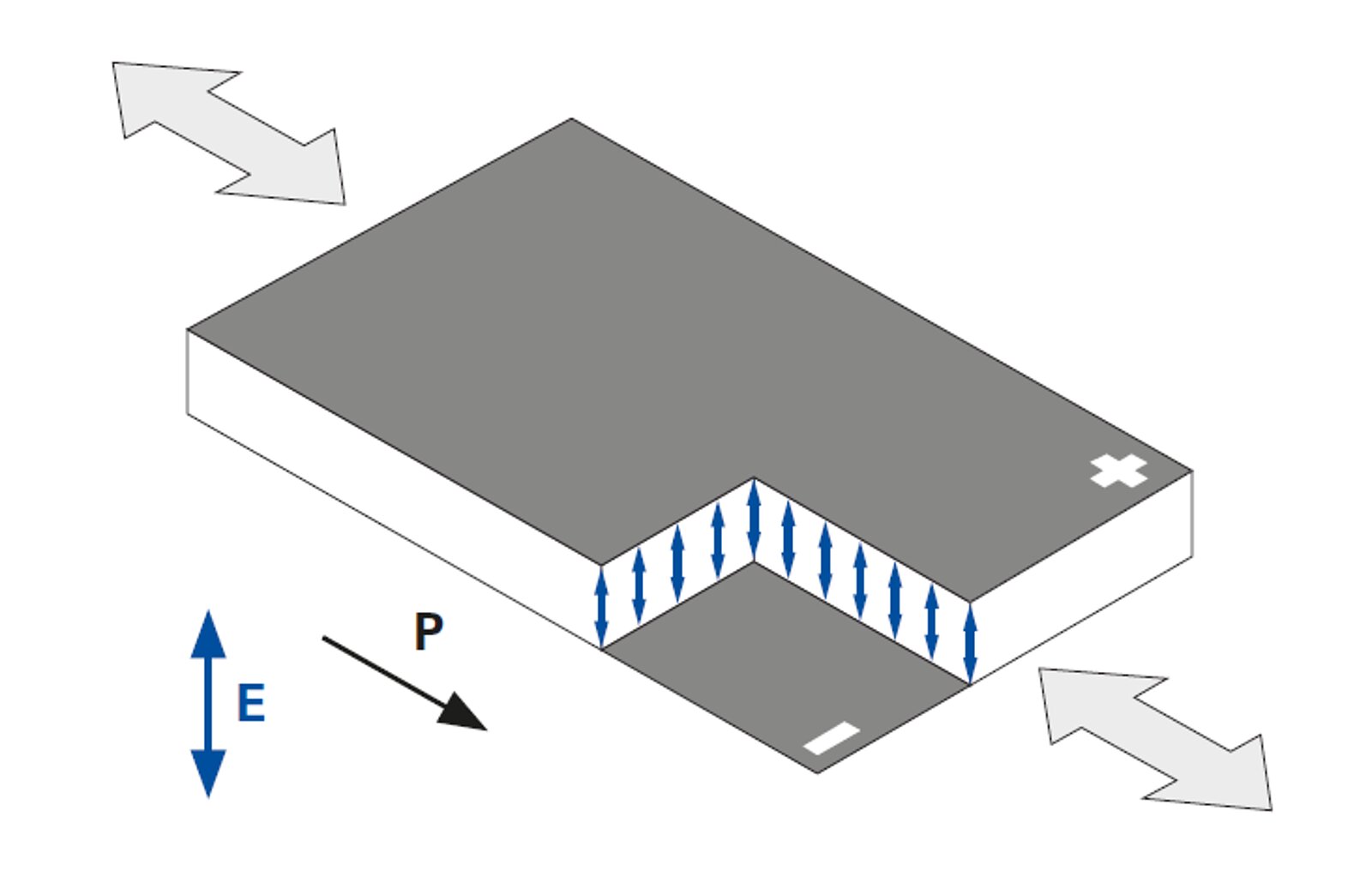 Beim DuraAct Power Flächenwandler nutzt das Multilayer-Piezoelement den Longitudinal- oder d33-Effekt. Die Auslenkung erfolgt parallel zum elektrischen Feld E und der Polarisationsrichtung P des Piezoaktors. Die piezoelektrischen Ladungskoeffizienten d33 für die longitudinale Auslenkung sind deutlich höher als für die transversale Auslenkung, die erreichbaren Auslenkungen sind dementsprechend größer als für vollkeramische Wandler.