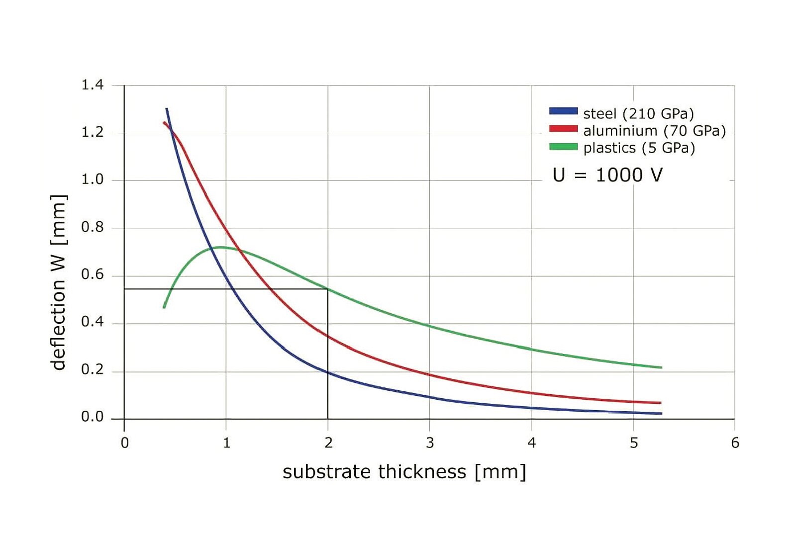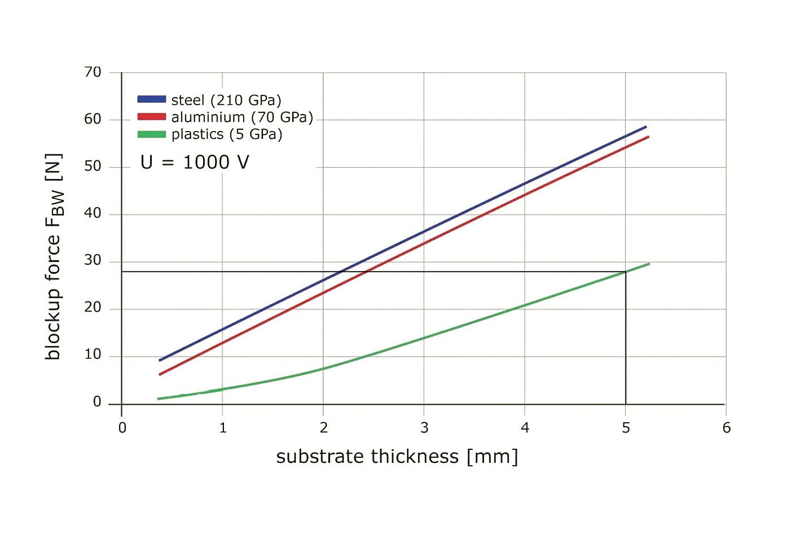 Um die freie Dehnung W0 und die Blockierkraft FBW abzuschätzen, können Diagramme verwendet werden, die beispielhaft die erreichbaren Auslenkungen und Kräfte in Abhängigkeit von der Dicke und Steifigkeit des verwendeten Substrats zeigen. Die Erstellung der beiden Diagramme erfolgte auf Basis zweier Substrate mit einer Länge von 50 mm aus unterschiedlichen Materialien, die mit einem DuraAct Flächenwandler des Typs P-876.A15 bestückt wurden. Zusammen mit dem Arbeitsdiagramm bilden die Diagramme der Biegewandler eine effektive Grundlage, um die Leistung und das Verhalten eines Aktors für einen spezifischen Einsatzfall abzuschätzen. Sie werden daher auf jedem Datenblatt angegeben.