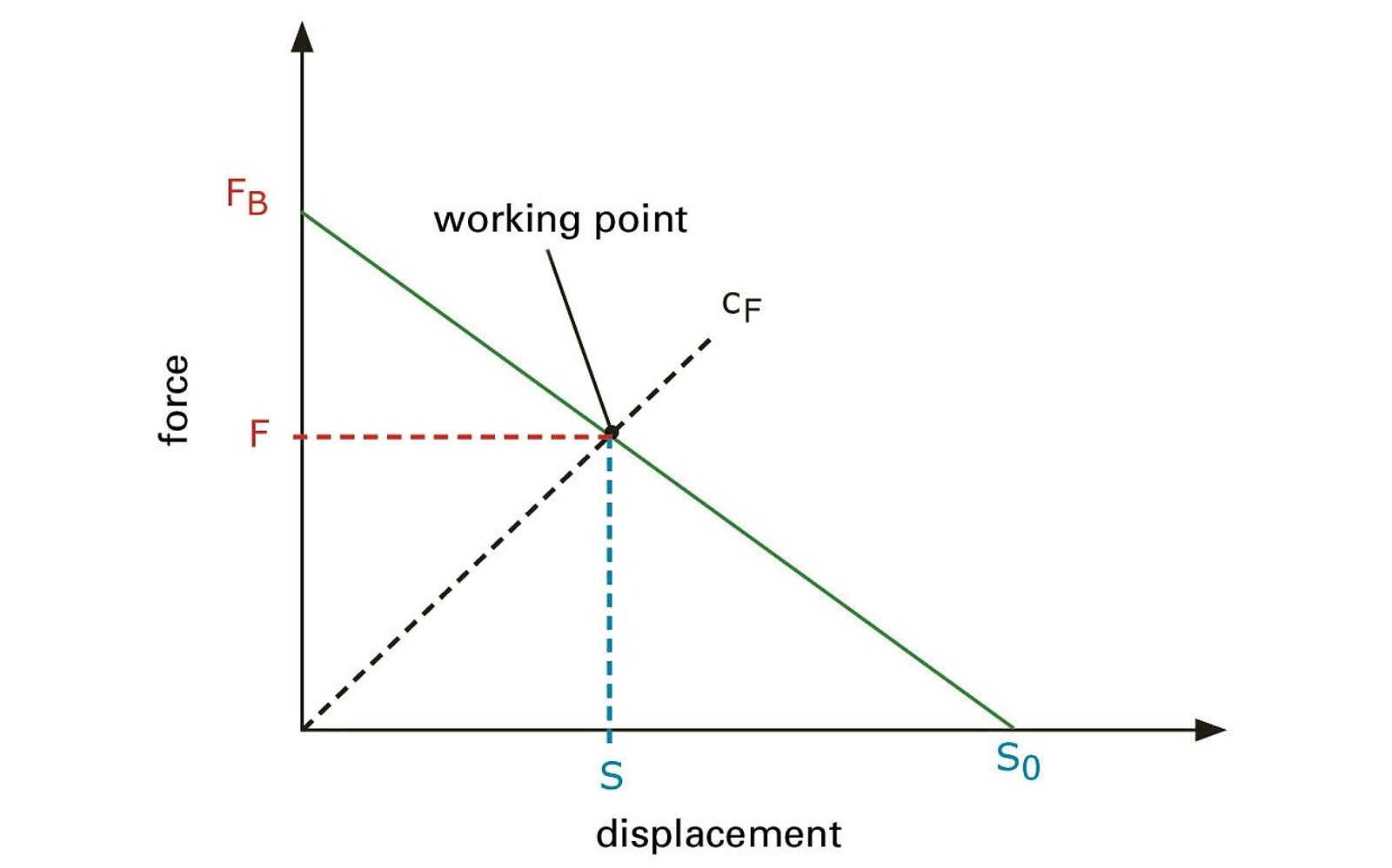 Werden beide Kennwerte in ein Diagramm eingetragen und mit einer Linie verbunden, ergibt sich das Arbeitsdiagramm des Aktors. Die Verbindungslinie wird als Arbeitsgerade bezeichnet. Aus dem Diagramm kann das Verhältnis der äußeren Kraft zur Auslenkung abgelesen werden. In den meisten Anwendungsfällen arbeitet der Aktor gegen eine elastische Struktur, etwa bei der Verformung einer Feder oder beim Verbiegen eines Blechs. Soll der Aktor beispielsweise eine Feder verformen, wird die Kennlinie der Feder mit der Steifigkeit cF in das Arbeitsdiagramm eingetragen. Der Schnittpunkt der Arbeitsgeraden mit der Kennlinie bezeichnet den Arbeitspunkt. Am effektivsten arbeitet der Aktor, wenn der Arbeitspunkt auf der Mitte der Arbeitsgeraden liegt.