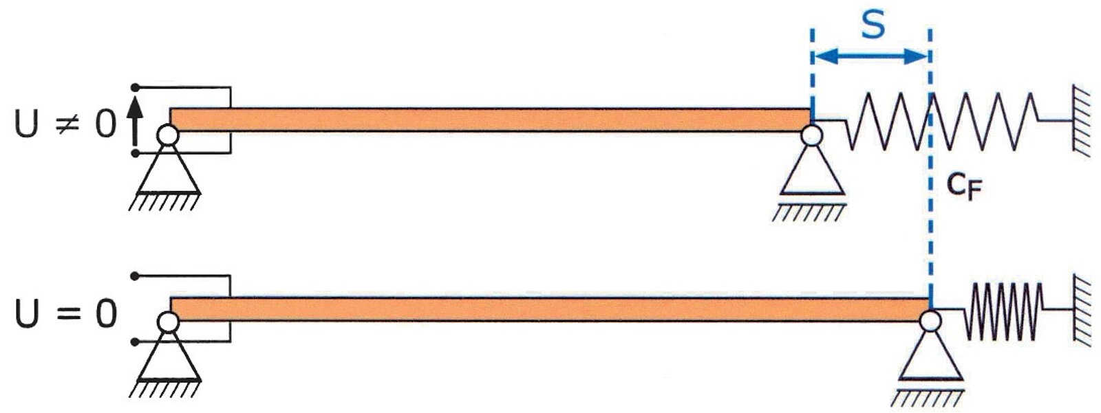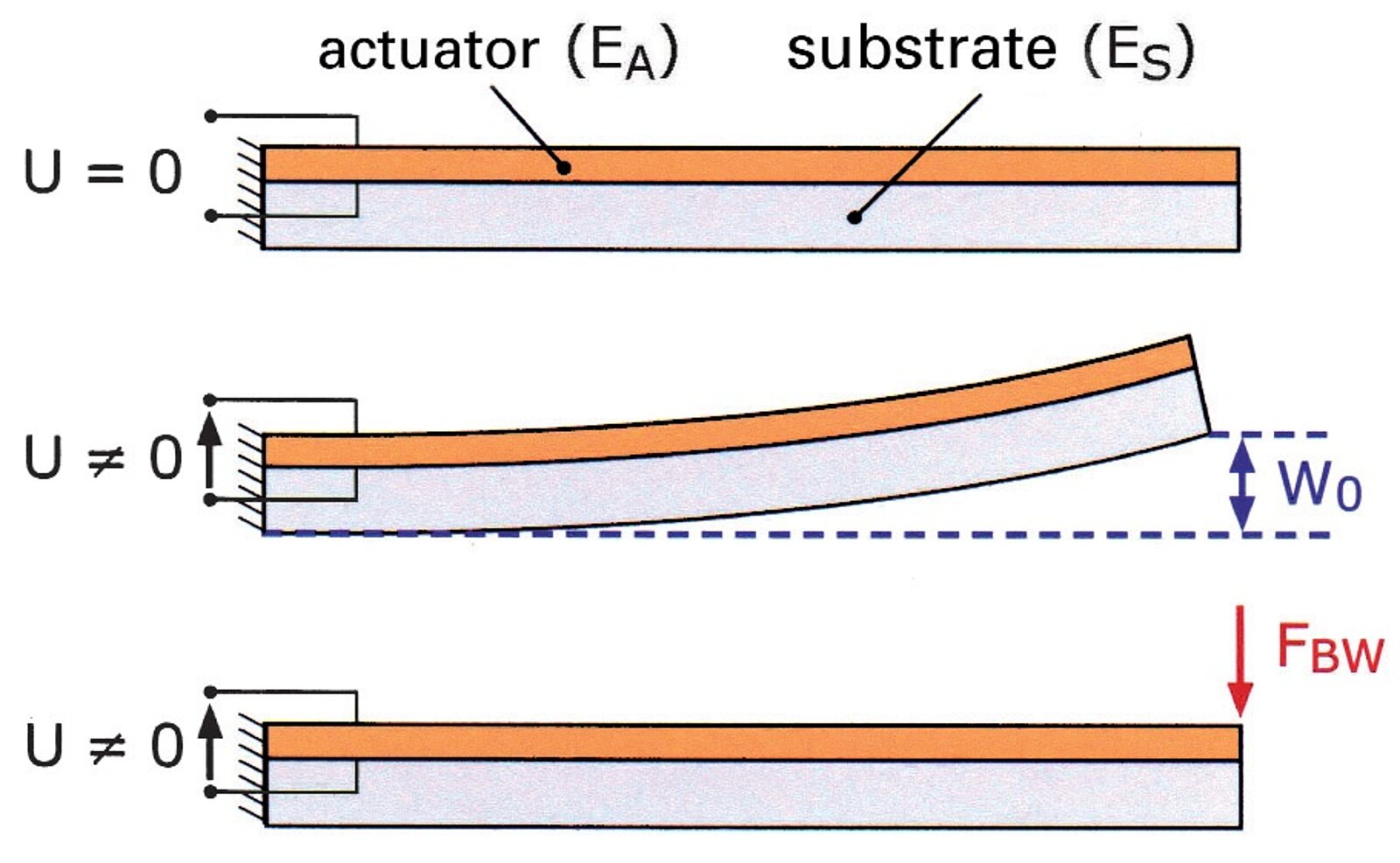 Die aktorischen Eigenschaften piezokeramischer Wandler werden im Wesentlichen durch zwei Kenngrößen beschrieben: Die Blockierkraft FB und die freie Auslenkung S0. Wird der unbehinderte (freie) Aktor mit einer Spannung U angesteuert, erreicht er seine maximale Auslenkung S0. Die Kraft, die notwendig ist, um den maximal ausgelenkten Aktor wieder auf seine ursprüngliche Lange zurückzudrücken, wird als Blockierkraft FBI bezeichnet.