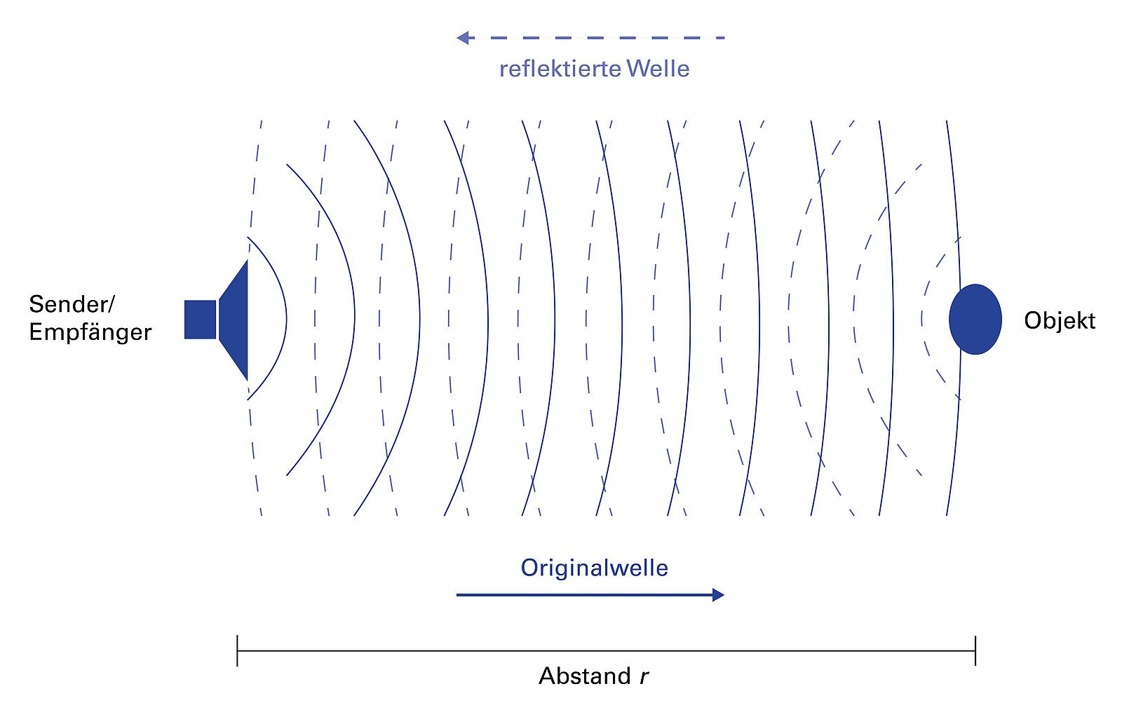 Das piezokeramische Element sendet einen Ultraschallimpuls aus. Die damit ausgelösten Schallwellen breiten sich aus und treffen auf ein Objekt. Dort werden sie reflektiert und teilweise absorbiert. Das gleiche Piezoelement empfängt die reflektierten Wellen. Die Laufzeitdifferenz Δt zwischen Aussenden und Empfang der Schallwellen gibt Aufschluss über die Entfernung r zwischen Schallquelle und Objekt. Unter Kenntnis der Schallgeschwindigkeit c im umgebenden Medium kann diese Wegstrecke r berechnet werden: