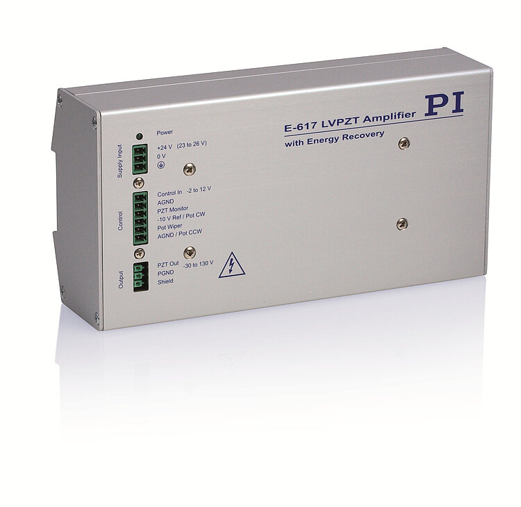 Das effiziente Schaltungsprinzip reduziert die Leistungsaufnahme und die Abwärme gerade bei dynamischen Anwendungen deutlich. So wird die Energie per Puls-Weiten-Modulation (PWM) verlustarm in den Piezo eingekoppelt. Die beim Entladen des Piezos anfallende Energie wird über Energierückgewinnung für das nächste Aufladen bereitgestellt. Zum Betrieb genügt eine unipolare Versorgungsspannung zwischen 23 und 26 V DC.