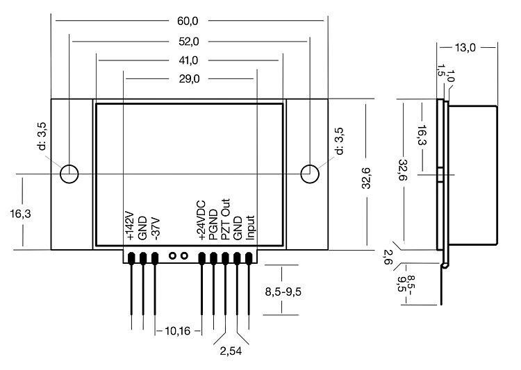 Kompaktes OEM-Modul in geschirmtem Metallgehäuse; einfache Integration über Lötstifte zur Platinenmontage; ideal zum Aufbau mehrkanaliger Lösungen. Tischgerät für Laboranwendungen und schnelle Inbetriebnahme. Betriebsspannung 24 V, Piezospannung und andere Versorgungsspannungen werden intern erzeugt.