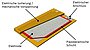 Laminierte Struktur aus einer piezokeramischen Platte, Elektroden und Polymermaterialien. Herstellung durch blasenfreies Injektionsverfahren. Die Polymerummantelung dient gleichzeitig als elektrische Isolierung und als mechanische Vorspannung, so dass der DuraAct biegsam ist.